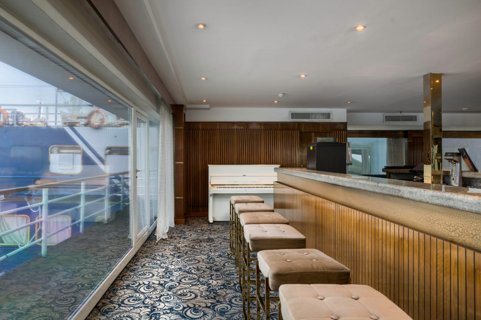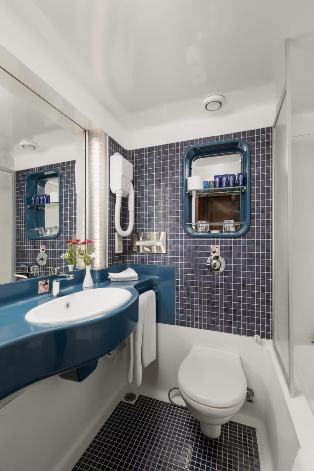 All Cabins include a panoramic wall-to-wall window, a bathroom with a bathtub, individually controlled air conditioning, in-house music and video channels, a mini bar, a hairdryer, and shaving sockets.